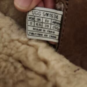 UGG women's leather boots in size 8, brown with cozy sheepskin lining. Style S/N 1634 F80070, perfect for warmth and comfort.