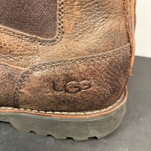 Built for durability and style, these UGG leather work boots feature a rustic brown distressed finish, sturdy lug sole, and easy pull-on Chelsea design. Perfect for work, outdoor wear, or casual everyday style.