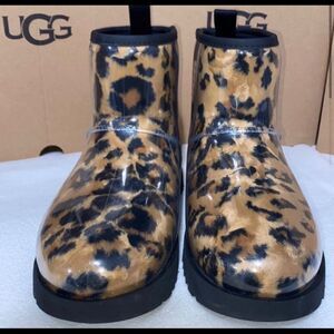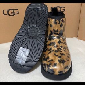 Stylish leopard print ankle boots. Features black sole and trim. Iconic UGG branding on the side.