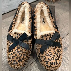 Soft suede exterior, fully lined, UGGpure natural wool lining, fixed satin bow, soft rubber outsole, leopard print exterior, sheep fur interior.