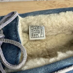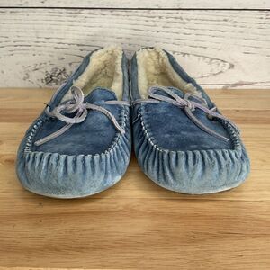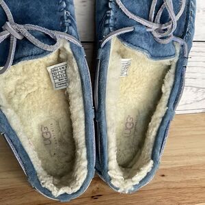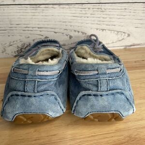 Women’s UGG Suede Moccasins Blue Lined Loafers Size 10.