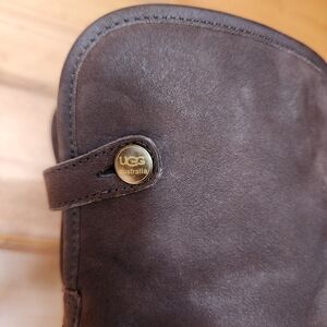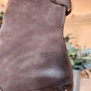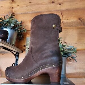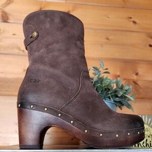 UGG Lynnea Fold Burnished Leather Shearling Sheepskin Wood Heel Clog Boots Sz 7