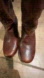 Lynnea II, chestnut brown leather, sheepskin fur lined, clog boots by UGG in a women's size 9. Style # 1001793. Mid calf boots but can be folded over. Wooden heels with rubber soles. Metal stud trim. The leather uppers have some distressed areas and some nicks. Interior lining is clean and fluffy. Pre-owned with some signs of wear from normal use.