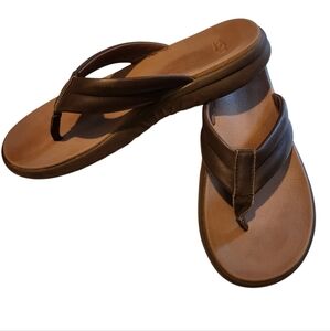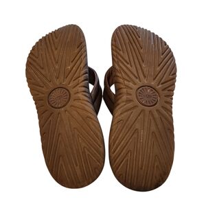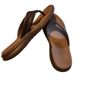 These flip-flops are characterized by their brown leather upper and a cushioned footbed, typical of UGG footwear designed for comfort.