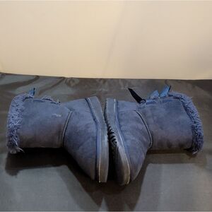 UGG MINI BAILEY BOW RETRO SPOTS OCEAN BOOTS-WOMEN'S SIZE 5 COLOR ROYAL BLUE A satin bow with spotted print adorns the back of a supremely cozy boot made from plush genuine shearling. Now pretreated to repel water and stains, the boot also features a new Treadlite by UGG™ sole for added cushioning, traction, and durability. 1 1/4" heel 1" platform Pull-on style Leather and genuine shearling upper/genuine shearling lining/synthetic sole Shearling may be sourced from Australia, Ireland, the UK, or the USA. See packaging for confirmed country of origin