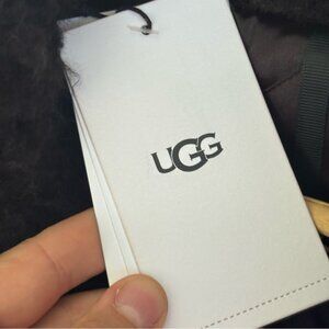 New with tags UGG Maeve teddy jacket in black. Made from signature plush sherpa with a standout oversized collar and hip-length cut. Full-zip front with logo pull, patch pockets lined in soft fleece, and cozy yet structured shape. Perfect for layering over casual or dressy looks, adding warmth and modern texture.