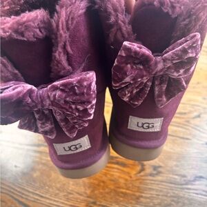 Elegant UGG boots with soft velvet bows. Deep maroon color enhances style. It has s small stain that can be cleaned.