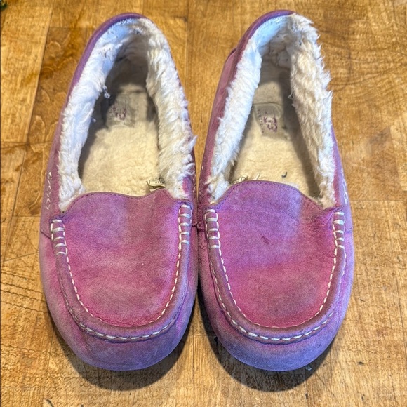Soft mauve suede moccasins with plush lining. Ideal for cozy comfort.
