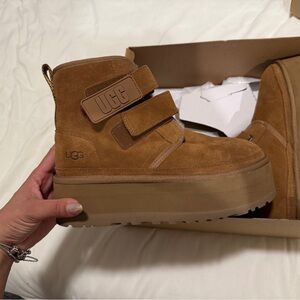 Stylish UGG boots with a platform sole. Crafted in rich brown suede. Perfect for casual outings.