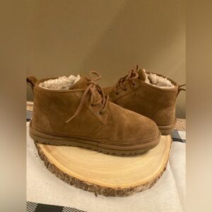 The UGG Men's Neumel Chukka Boots in Chesnut Brown feature a round toe, lace-up closure, and ankle shaft style. Made of suede with a sherpa lining and wool insole, these boots are insulated for the fall season. The synthetic outsole provides durability, and they come in US size 8 (UK size 7, EU size 40.5) with a medium width. The UGG Australia brand is known for its comfort and quality, making these boots a stylish and practical addition to any wardrobe. These are in good used condition.