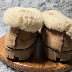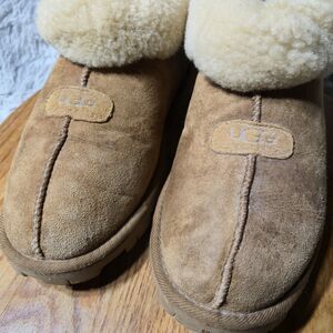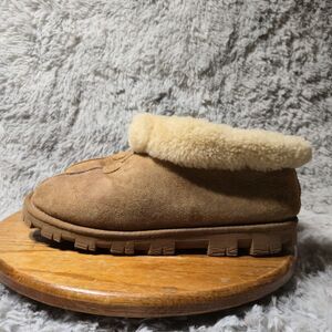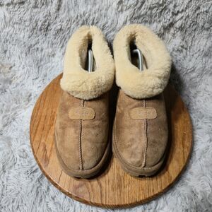 UGG Mens Size 11 Platform Slippers Sheepskin Lined Light Brown Leather Shoes