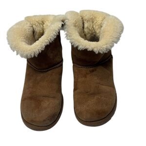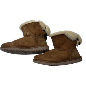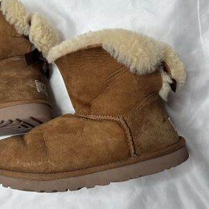 UGG Mini Bailey Bow ll Boots In Chestnut. Size 6. Good used condition. Has a stain on side as shown in picture. Still a lot of life left. Shaft 7 inches.