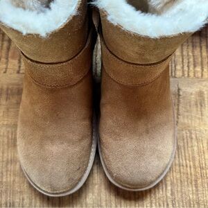 Warm UGG boots with soft white fur. Rich chestnut suede exterior. Ideal for winter wear.
