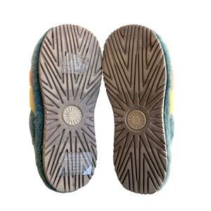 Soft UGG slippers with vibrant stripes. Features blue, pink, yellow, and cream tones.