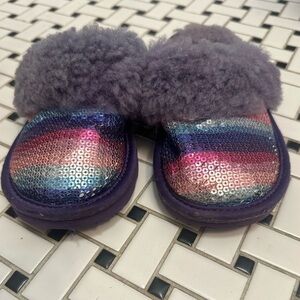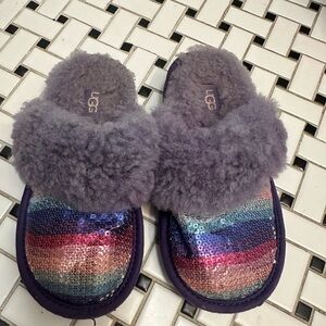 Vibrant UGG slippers featuring multicolor sequins. Soft plush trim for comfort.