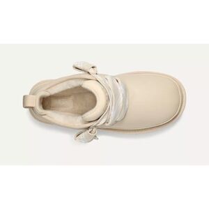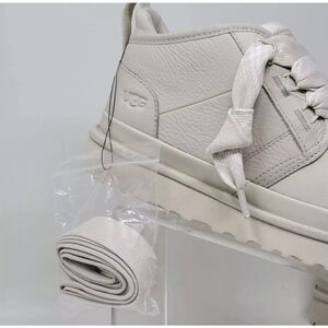 Introducing a pair of UGG Neumel FT ankle boots in a stylish Sea Salt color. These boots feature a round toe shape and lace-up closure for a secure fit. The upper is made of high-quality leather and lined with wool for added comfort. The outsole is made of rubber, making it durable and suitable for winter, fall, and spring seasons.