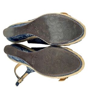 DETAIL: PEEP TOE. PLATFORM WITH JUTE TRIM. WRAPPED HEEL WITH DENIM LOGO PRINT. DECORATIVE BUCKLE ACROSS TOE. RUBBER OUT SOLE. SLINGBACK WITH ADJUTABLE BUCKLE.