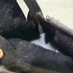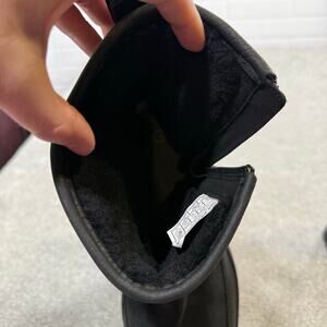 Description: Waterproof suede upper black booties; outside zipper closure; round toe; fabric & wool lining; foam footbed; ~5" shaft height; 2" molded heel; rubber traction sole