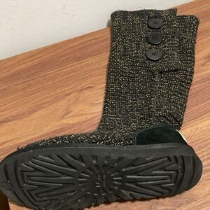 UGG NWOT Cardy knit boots in black tweed with gold metallic thread sparkling throughout. 3 large buttons adorn the sides. These boots can be worn folded down or straight up. Knitted wool/acrylic upper and rubber sole.