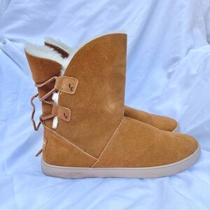 • Size 10. Shearling interior. Suede exterior. Rubber soles. Ties in the back to your preference.