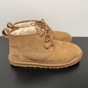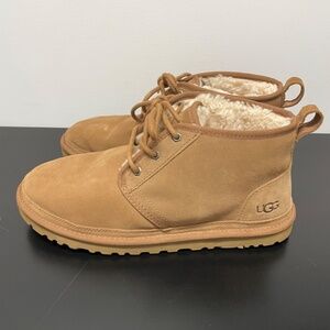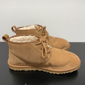 The UGG Neumel Boot in Chestnut is a stylish chukka boot designed for men. With a UK size of 10, AU size of 11, US size of 11, and EU size of 44, this boot is perfect for those looking for a comfortable and fashionable footwear option. Made from suede material in a classic brown color, the UGG Neumel Boot is a versatile choice that can be worn for various occasions.
