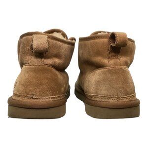 These UGG chukka boots in a classic tan hue offer comfortable choice for cooler days. Crafted from suede with a soft warm lining, they keep feet warm while maintaining style. Durable and versatile, they complement various casual outfits for an elevated look.