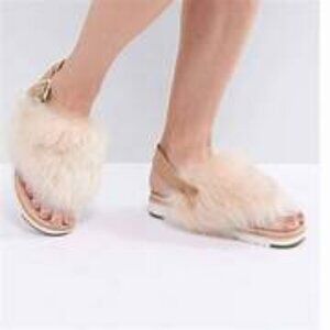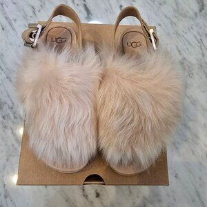 Never worn, new in original box. Rocker-inspired fluffy sheepskin over an easy summer thong sandal with 3 layers of foam cushion the footbed. Adjustable side buckle.