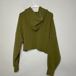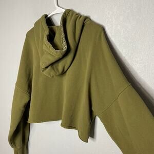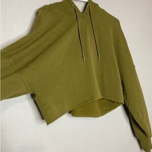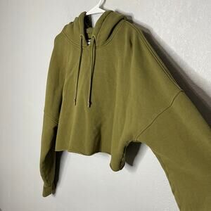 Stylish olive green cropped hoodie. Features a drawstring hood. Perfect for casual wear.