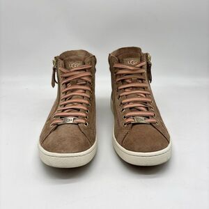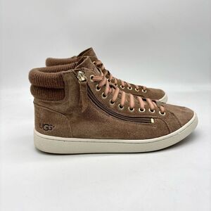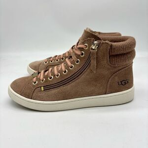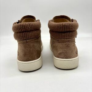 Features tan suede upper with padded knit ankle collar. Side zip. Two-tone laces.