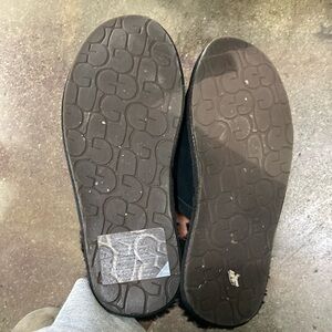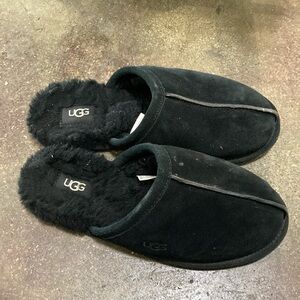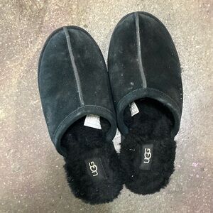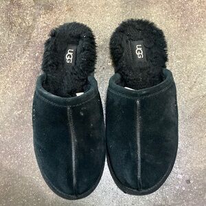 Cozy black suede slippers with plush lining. Perfect for lounging at home. Slip-on style for easy wear.