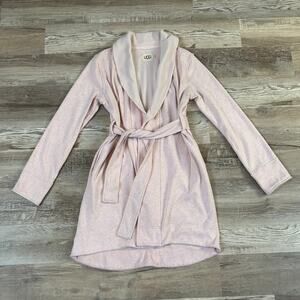 Soft belted robe-style coat from UGG in a pale heathered pink. Cotton-blend exterior with a plush polyester fleece lining. Two front pockets and extra-wide cuffs for ultimate comfort. Some light signs of wear, including a faint spot on sleeve and belt—see photos.