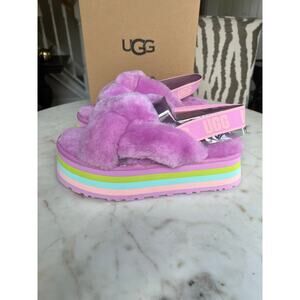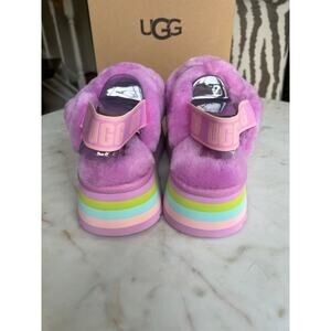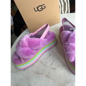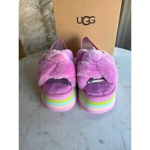 UGG Pink Rainbow Platform Disco Knot Genuine Shearling Slide Slippers