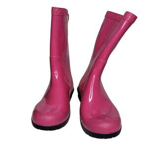 These UGG rain boots are crafted from durable rubber, ensuring your child stays dry and stylish in wet weather. The bright pink color adds a playful touch, making them a favorite for puddle jumping and outdoor adventures. The boots are designed with a sturdy sole for excellent traction, offering safety and comfort.
