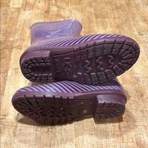 Embrace the elements with UGG's stylish purple winter and rain boots, featuring a distinctive striped pattern. These mid-calf boots combine a classic silhouette with a sturdy rubber sole, ensuring both fashion and functionality. Perfect for keeping your feet dry and comfortable during wet weather.