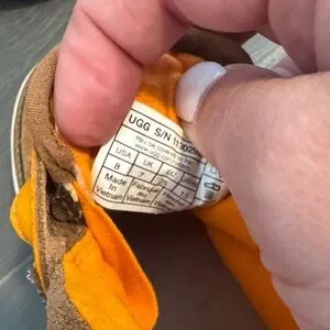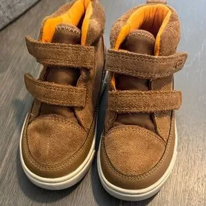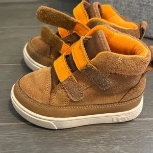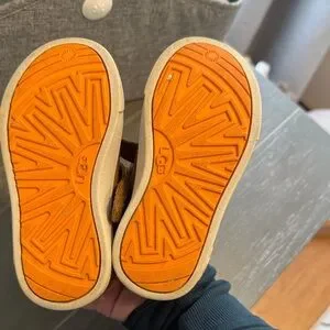 Cozy UGG boots for kids. Tan suede with bright orange accents. Easy velcro straps. Like new worn once.