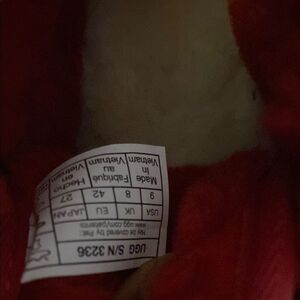 Step into comfort and style with these UGG red boots, crafted from a soft suede-like material. The plush fuzzy lining ensures warmth, while the lace-up front offers a secure fit. A thick rubber sole provides durability and a bold look.