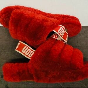 Vibrant red fluffy slides by UGG. Ideal for cozy comfort. Wedge heel, rubber soles, elastic heel band. Very good condition. Size 8.