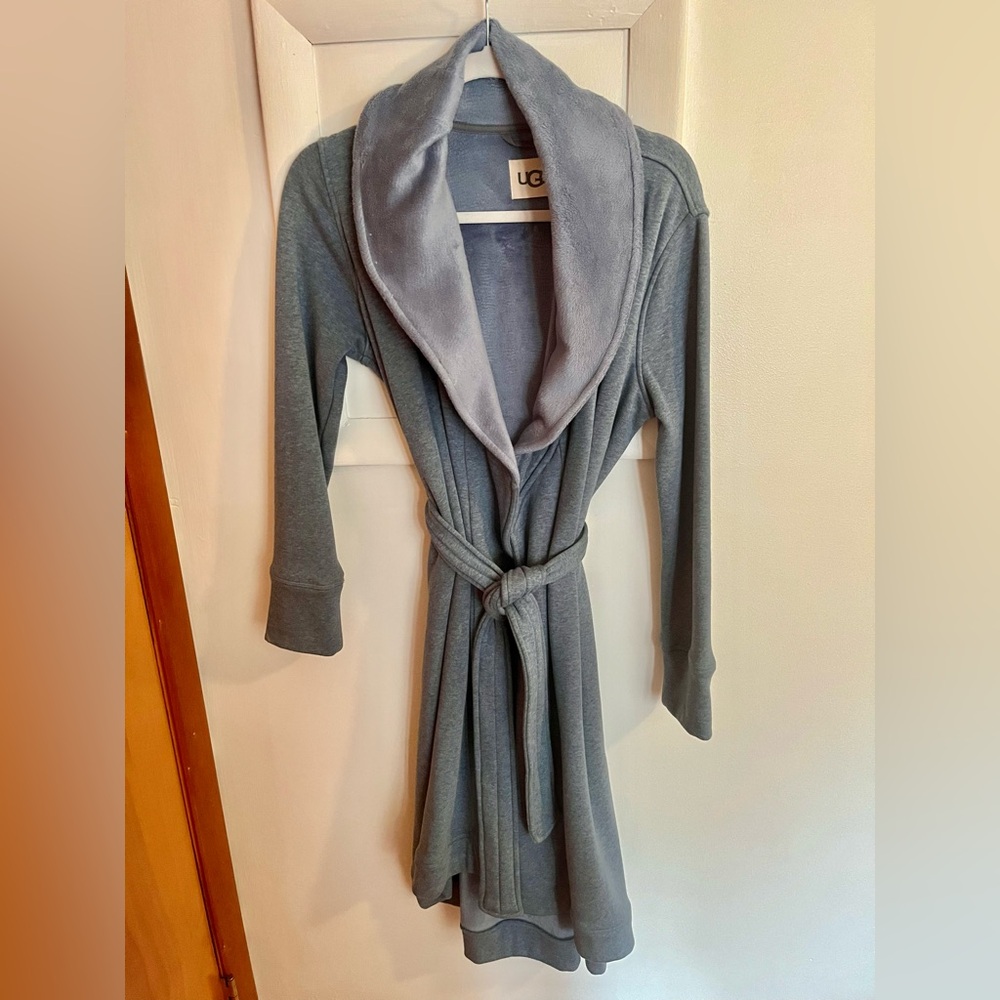Plush robe by UGG. Includes a comfortable collar and adjustable tie. Size Small. color is blue grey