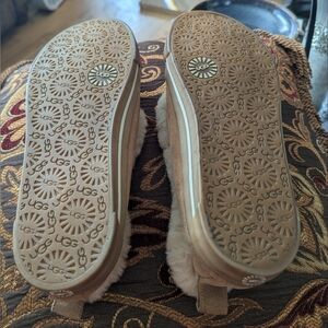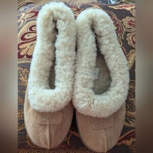 This style features a distinctive sheepskin collar that "spills" from the top of the slipper & a vulcanized rubber outsole for durability and support...