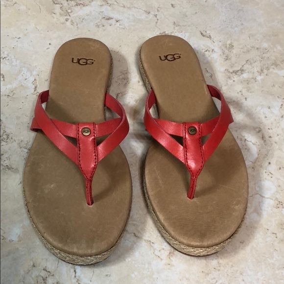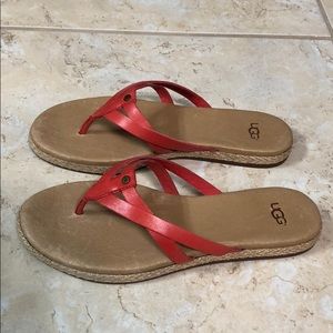Barely worn UGG sandals in coral red color with cushioned footbed. Very comfy! Size 5.5.
