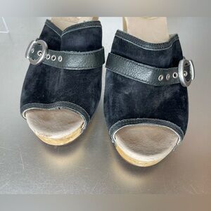 UGG Sandals Women's Sz 8 Black Suede Leather Buckle Platform Wooden Heel
