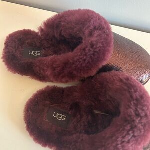 Plush UGG slippers in deep maroon. Ideal for cozy comfort.