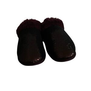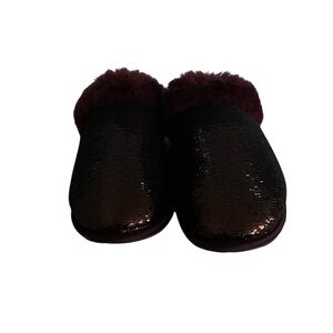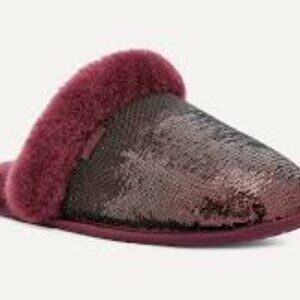 Slip on these Scuffette II mirror ball shoes by UGG when you need to relax in style. Designed with sparkly burgundy sequins and fur for warmth. These slip on shoes are great for inside and outside.