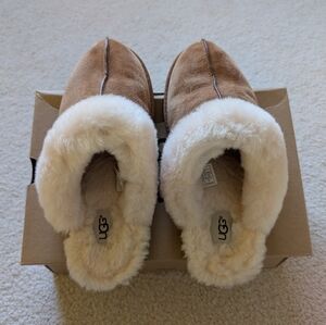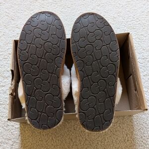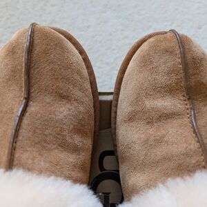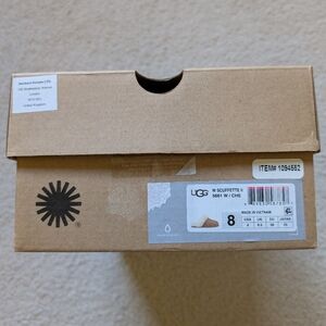 Excellent condition UGG slippers, only worn a handful of times, in color Chestnut. Women's size 8, no wear on the soles. Top seams appear to be crackling a little and the left slipper has a few minor marks (shown in photos) and will be reflected in the price. Will include the original box and UGG booklet. Open to offers!