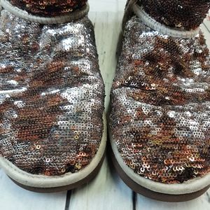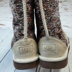 Stylish UGG winter boots. Covered in shimmering sequins. Cozy and warm interior.