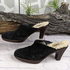 UGG Shearling Lined Black Suede Heeled Mules Clogs