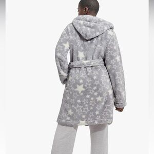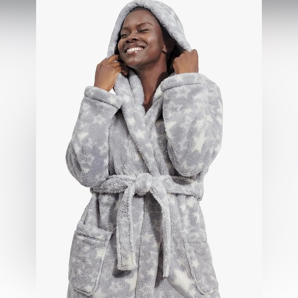 Plush robe with a cozy hood. Features a tie belt and pockets. Ideal for relaxation.