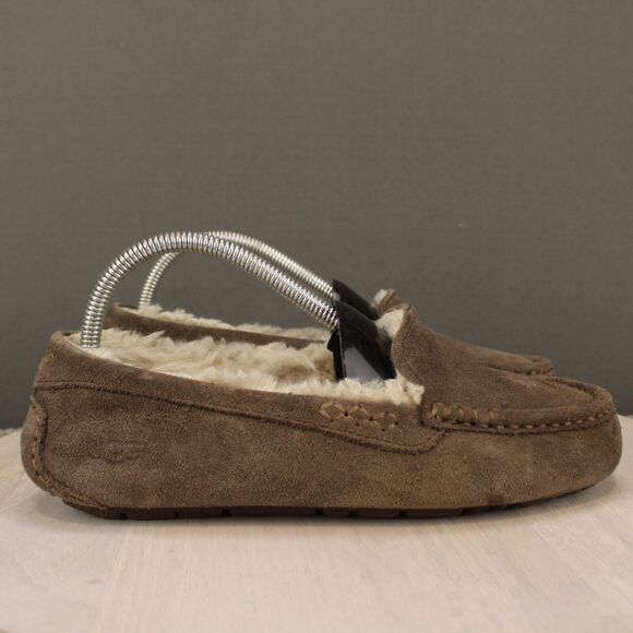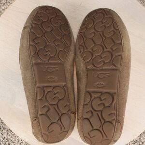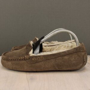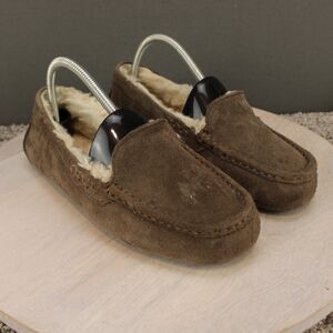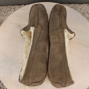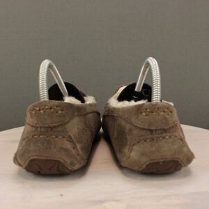 UGG suede shearling slippers slip on womens 8 brown with cozy lining and cushioned sole perfect for lounging and everyday indoor wear.