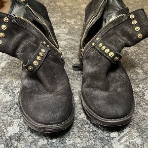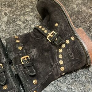 This is a UGG Sz 9 Fabrizia Stud Boots Black Suede Goldtone Grommets Side Zip. The size tag has been removed but these are size 9. Inner zippers work perfectly. Leather and shearling lined. No odors. Adjustable side buckles. The heels could use a resole if you choose.