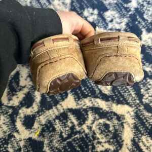 Experience comfort with UGG's tan moccasin slippers. Perfect for lounging, these slippers offer a cozy fit and stylish design. Good condition.
